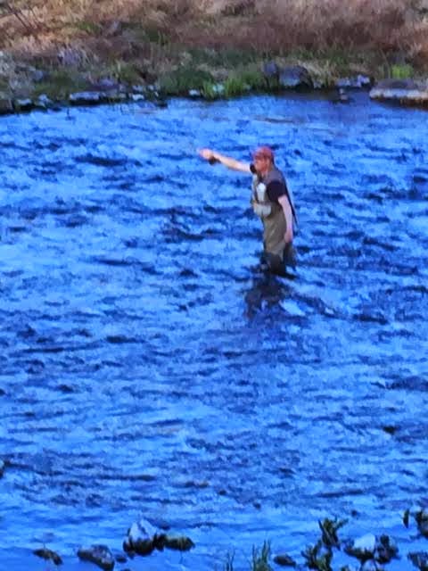 And then there's your writer, standing knee deep in a nice run, where I took a small rainbow on a sparkle emerger. Lots of caddis were hatching in this fast water, and surprisingly we didn't see a single rise. That water was clear from my vantage point - the blue must be a reflection of the sky.
