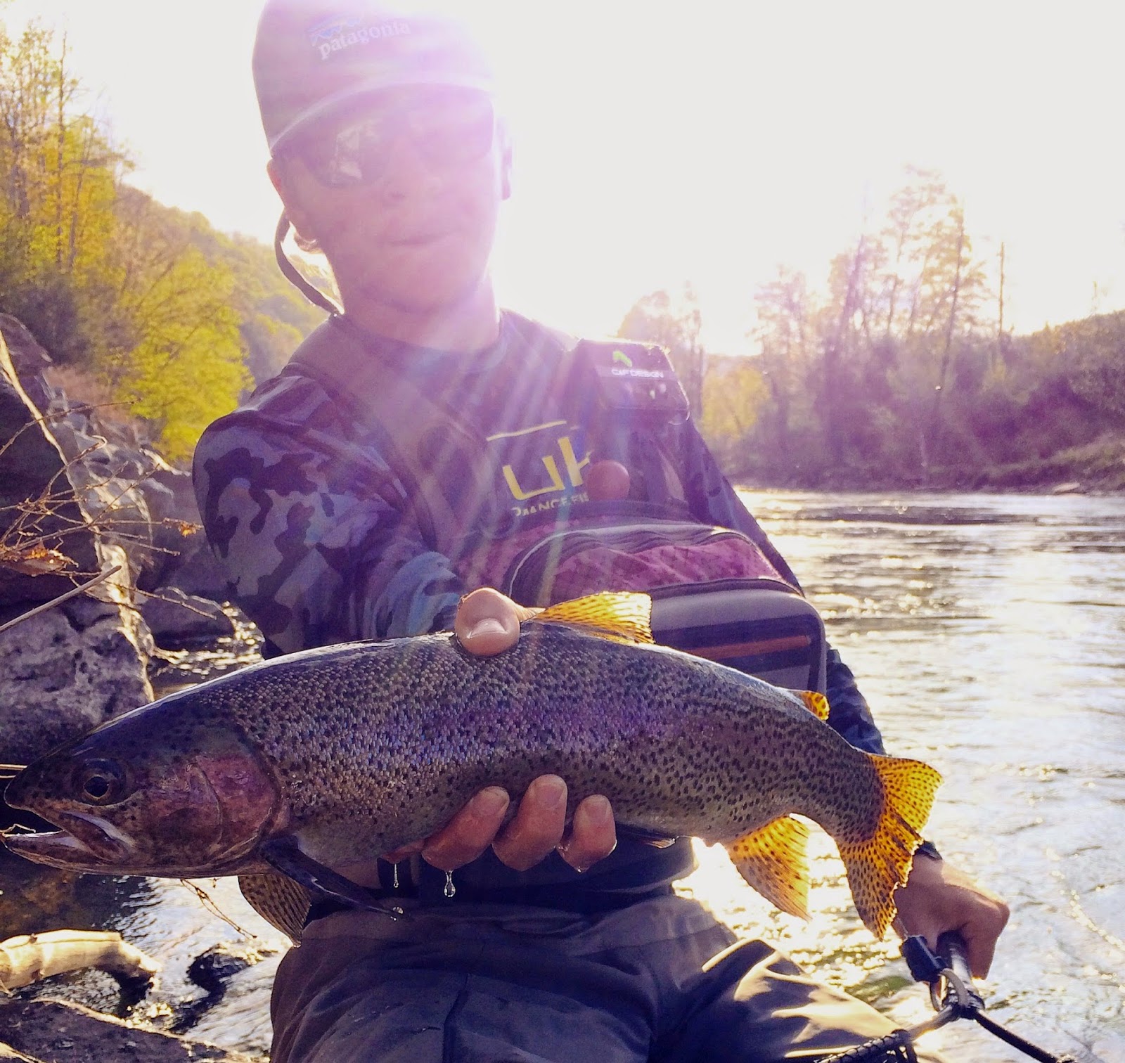 Fast forward to tonight. I met a few friends on the river about 7:00 PM, and the only bugs we saw were midges and small caddis. About 7:30 I looked up and just off the new, green tree canopy I could see quite a few rusty spinners, some with egg sacs and some without. Fish rose occasionally but nothing steady. I took a couple of those fish on sulphur soft hackle emegers fished in the film, but it was slim pickings. As 8:00 rolled around a few sulphur duns were in the air and very few on the water. The spinners were now flying low just over the water. As dusk neared those spinners began to fall on the water and fish rose, but nothing like the night before....until it got dark. Then fish rose everywhere and of course, I could not see a thing and called it a day. I did mange to catch a few more fish on rusty spinners before it got dark, but it was nothing like last night. I guess that's what keeps us coming back.