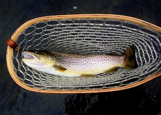 Once I was in position, I dropped my fly about three above the working fish, only to have the fly move in a circle before it got to where the fish was rising. Multiple current played havoc with my fly and line, which meant I had to drop the fly only a few inches above the fish in order to get a good drift. It also meant the fish had to react in a nanosecond in deciding if it wanted my offering. It was the only option. So I false cast for a bit to feel the rhythm of the rod and line as it laid out in front of me in the air. Once I was comfortable, I stopped my forward cast as the fly moved past the target, and it bounced back with slack in the leader while the fly landed only 6 inches or so above where the fish had been rising. The fly moved a few inches and then a golden shape moved rapidly from below and grabbed the fly like it was just another caddis drifting by. After a brief but spirited fight, I reached out with my net and landed a nice brown of about 14 inches.