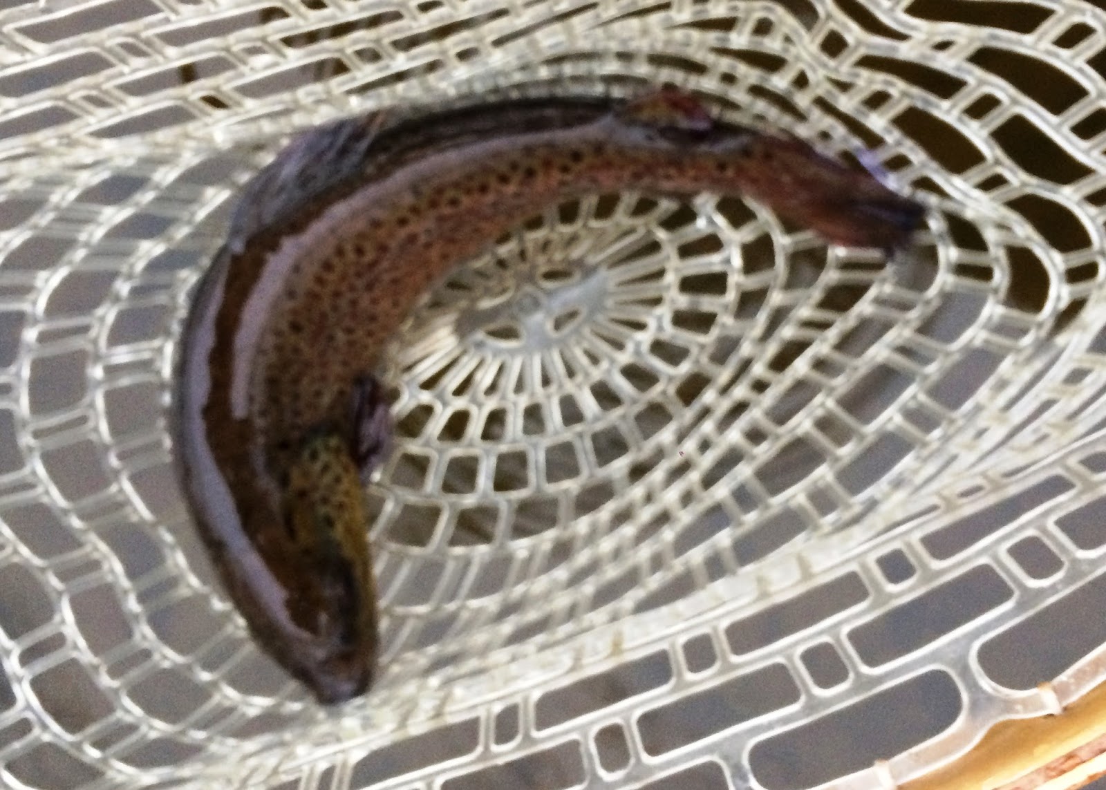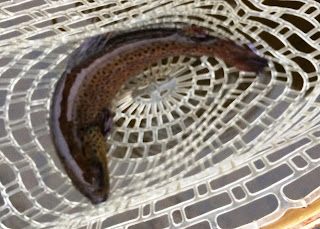 After about 10 minutes, and a single take that I missed, I decided to switch flies and tied on a #14 weighted Walt's Worm. I fished this fly the same as I did the buzzer, and took a short step downstream after every few casts. A few minutes into it, I had a solid take and after a brief fight landed a very dark brown trout that was about 11 inches in length. I'm pretty sure this was one of the fish from Shannon's Christmas Stocking a few days earlier.