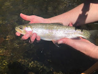Once the fish started rising, I switched to a #20 blue-winged olive sparkle dun and began taking fish on top. This lasted for a few hours into early afternoon, and a good cast with a drag-free drift over a working fish often drew a good take. We took dozens of chunky rainbows and browns along with an occasional cutthroat trout. Each day we fished a different section of river, each with its own character, and did well. I used one fly for almost all of the fish I took on top - I had to switch to another once in a while as the fly would get totally water logged. Once it dried though, it went back on the end of my 6X tippet. It took a beating all three days, but it stood the test as you can see here. It's now retired.