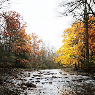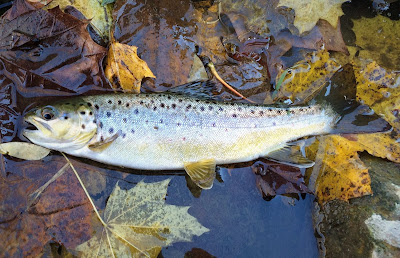 I managed to get out on the South Branch this afternoon for a few hours and ended the weekend on a high note. It was around 2:00 pm when I waded along the banks of the low, chilly water that was so clear one could make out every leaf moving along in the water column, and even some of the trout holding on the bottom among the rocks and stones. The skies were mostly clear with a decent breeze that made the 45 degree F air feel like it was much colder. There wasn't another angler in site and only the faint sound of bicyclists and their chatting from the old railroad bed turned walking/cycling path that follows the river a short distance away.