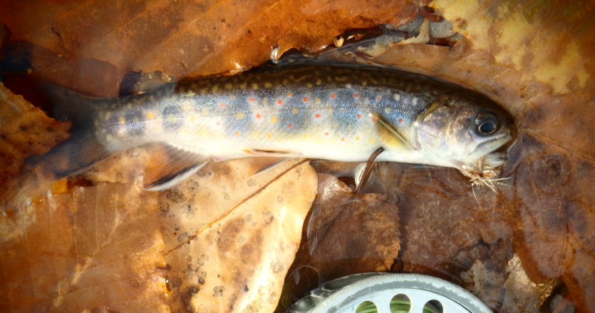 I wandered some trails and found my way down into a hollow. The brook was clear, cold, and very low; somehow I don’t think the Garden State received as much rain as the eastern Catskills did in late October. Fish dimpled as I setup; a few tiny midges buzzed above the brook. Still I attached a #18 Adams, one of my favorite flies for situations like this. Without much effort, I successfully put all these fish down without nicking any. Thus I slowly worked my way up the tiny flow.
