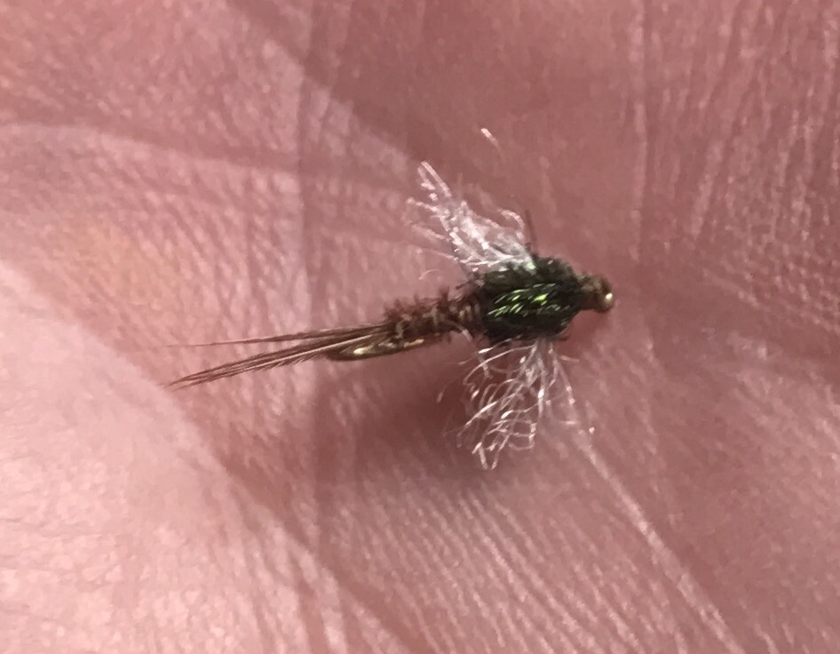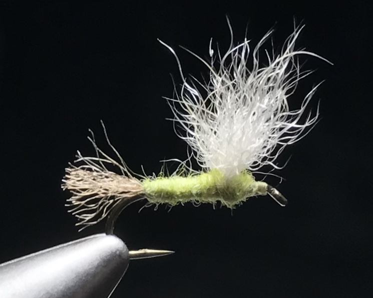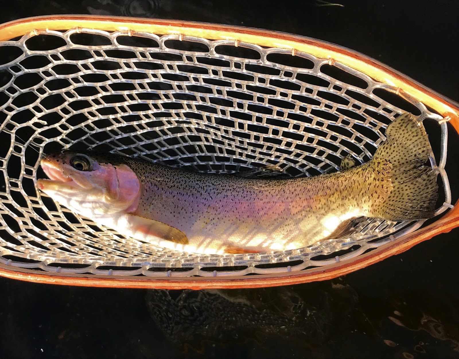 I reeled in my line and quickly changed my fly to a pattern #16 pmd/flav snowshoe pattern and began working out line before dropping the size #16 PMD imitation above the fish. The fly drifted a foot or so and then a nose poked the water surface and sucked it in. After a brief battle with the fish and accompanying weeds, I netted a nice 14 inch rainbow. At the same time I thought to myself, “I hope this isn’t going to be one of those first-cast-with-a- new-fly jinxes, where that’s it for the rest of the day.”
