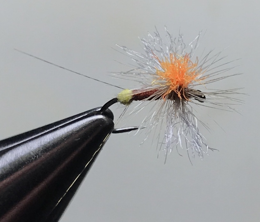 This is the Hi-Vis Rusty Spinner complete with egg sac that worked so well, particularly during morning spinner falls. This pattern has several versions, some with a cdc wing and rusty goose biot body, and often it is tied without the egg sac. This one is tied with a zelon wing and dubbed body - I tie it this way because I like the look and using zelon for the wing makes it a quick, durable tie. I don't have any well-chewed versions of this fly because by the last day I had lost all of those I had tied. (Note to self; tie more of these before you go fishing anywhere.)